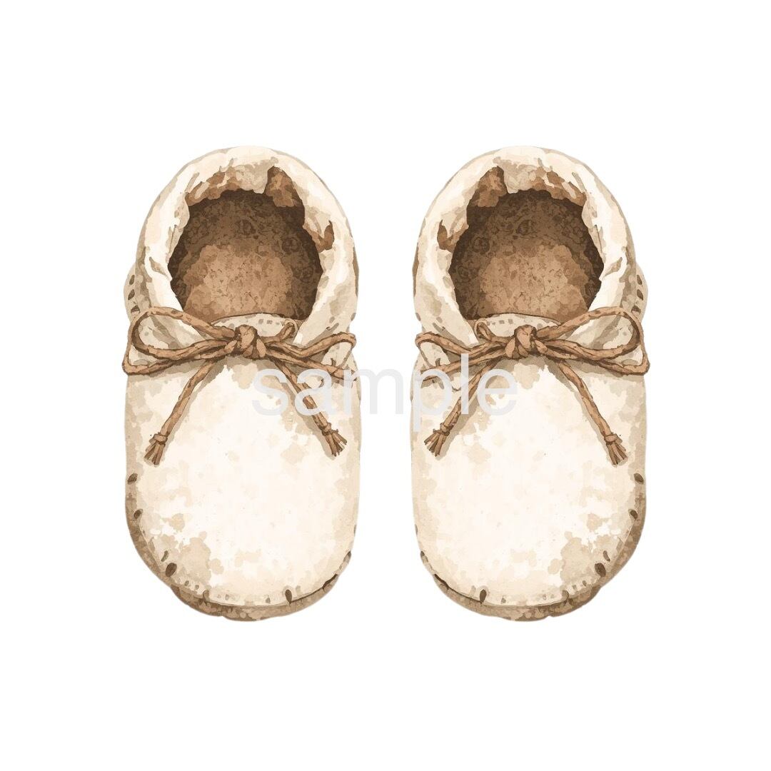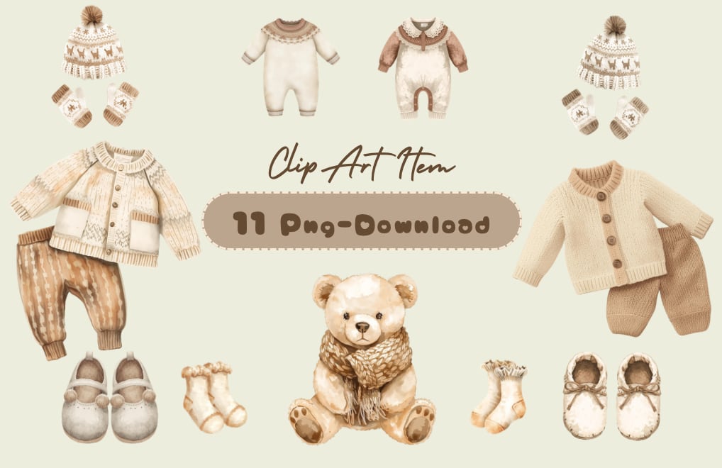 やわらかな白とブラウンを基調に、水彩画風で仕上げた可愛い『冬のベビー服』クリップアートです。