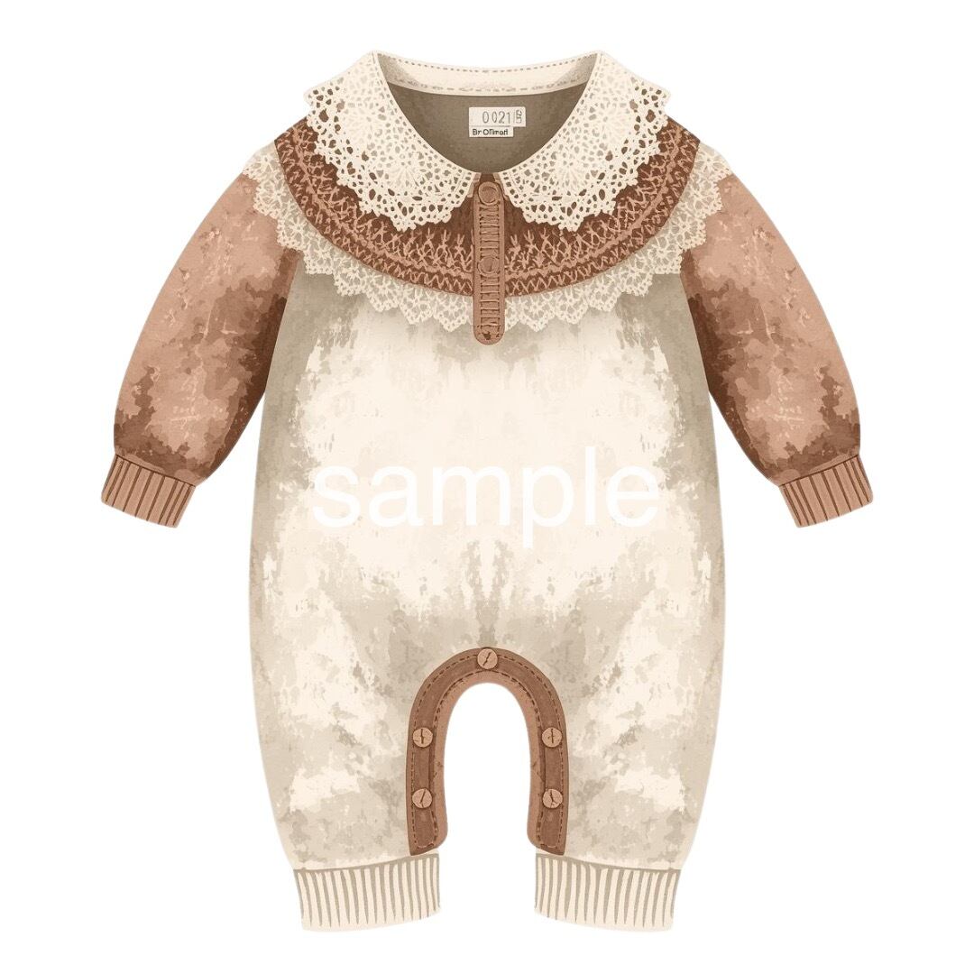 ニットロンパースや帽子、セットアップの洋服、マフラーを巻いたテディベアのぬいぐるみをプラスして、赤ちゃんらしいやさしいフォルムと柔らかな質感を大切に描きました♡