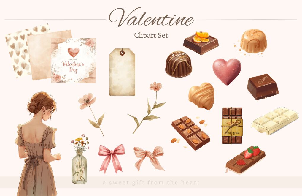 【Valentine Clipart & Template Set】 淡色×水彩 バレンタイン素材20点+Canvaテンプレート2種